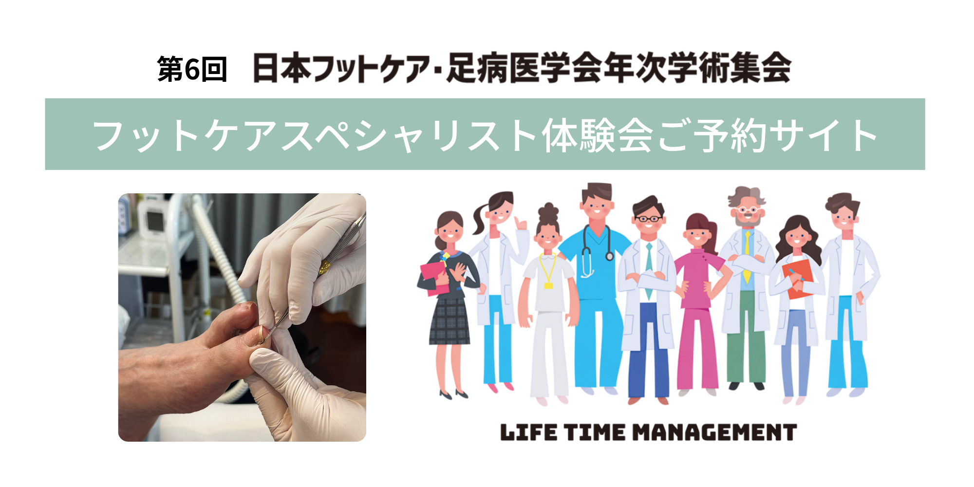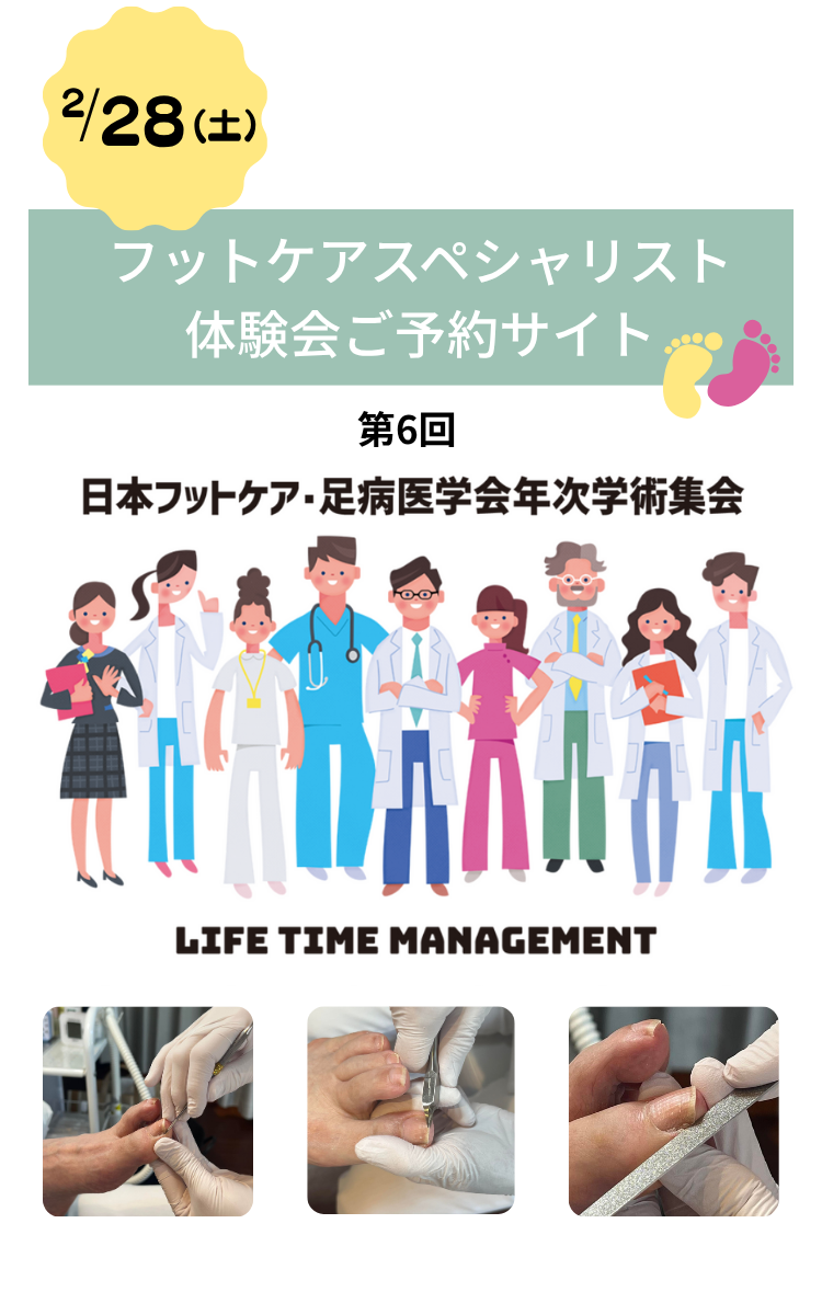 本ブースは、私たちフットケアスペシャリストによる施術が「安心・安全」であることを実際にご体験いただきながら広くご理解いただくとともに、医療現場との連携構築を目的とした取り組みの一環として企画されました。つきましては、誠に恐縮ではございますが、本ブースへのご参加は事前にお申し込みいただいた医療従事者の方の中から、抽選の結果当選された方に限らせていただきます。何卒ご理解とご協力を賜りますようお願い申し上げます。皆さまのご参加を心よりお待ち申し上げております。